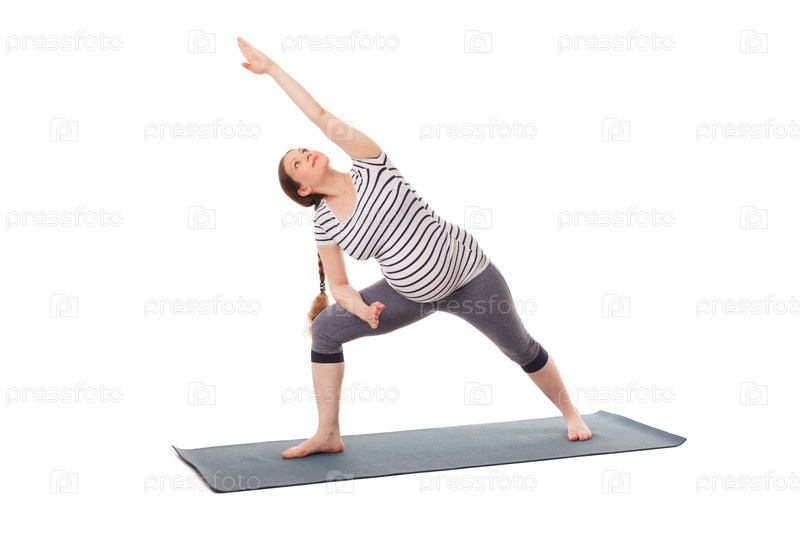 Йога упражнения для беременных женщин асан Утхита Парсваконасана расширенный латеральный угол поза, изолированная на белом фоне