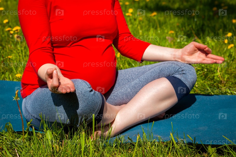 Беременный мужчина занимается пуной Suhasa на открытом воздухе на траве