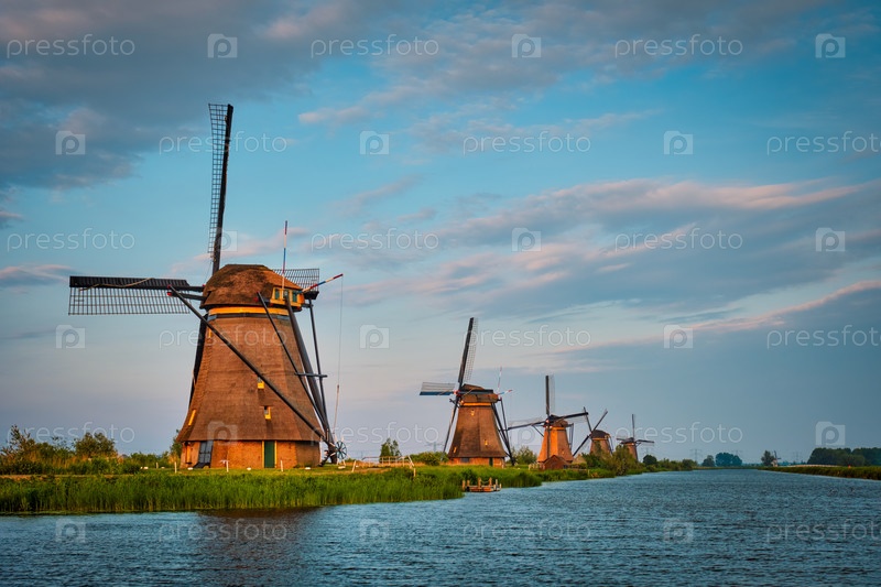 Голландский сельский пейзаж с ветряными мельницами на знаменитом туристическом месте Kinderdijk в Нидерландах при закате солнца с драматическим небом