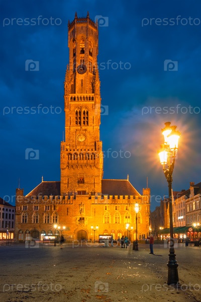 Башня Белфрея знаменитое туристическое направление и площадь Grote Markt в Брюгге, Бельгия на закате