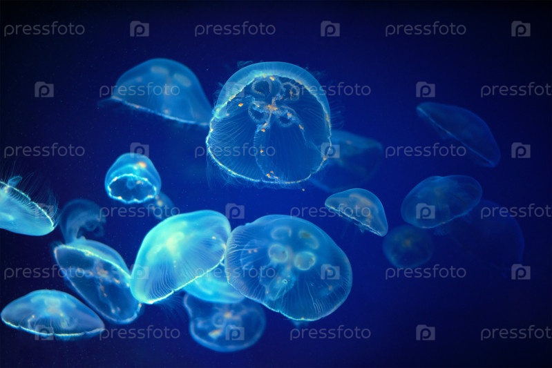 Голубая медуза плавает под водой