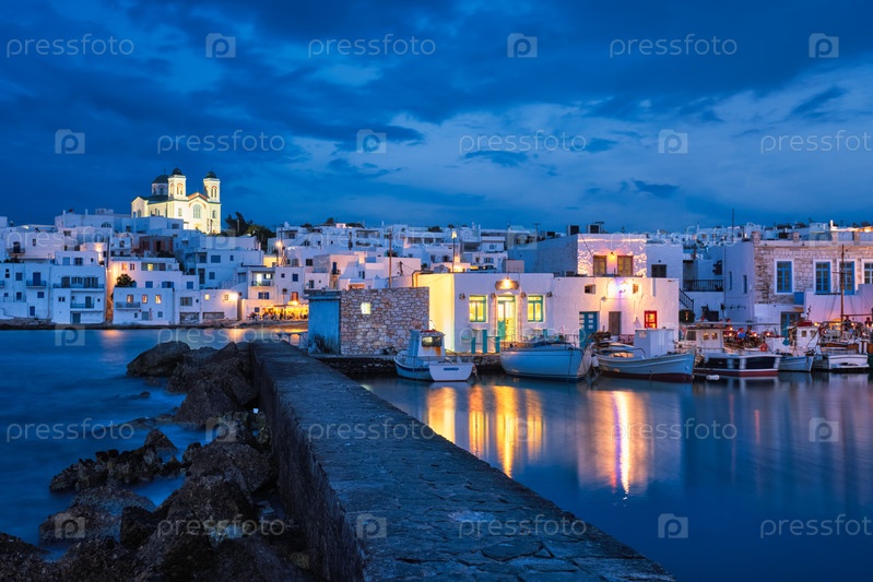 Прекрасный вид на город Науза в знаменитой туристической достопримечательности острова Парос, Греция с традиционными белыми домами и причаленными рыбацкими лодками, освещенными ночью