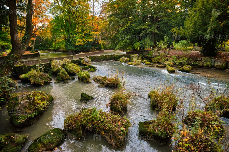 Мюнхенский английский сад Englischer Garten Park и река Эйсбах с искусственным водопадом. Осенние цвета на деревьях, листьях и текущей реке