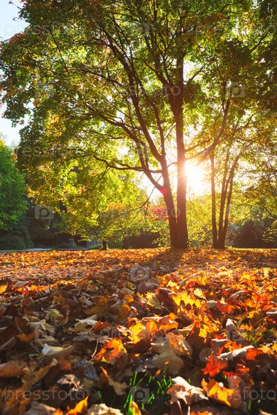 Золотая осень октября в знаменитом мюнхенском месте отдыха - Englischer Garten. английский сад с упавшими листьями и золотым солнечным светом. Мюнхен, Бавария, Германия