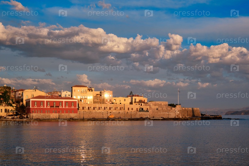 Живописный старый порт Хании является одной из достопримечательностей и туристических направлений Крита утром при восходе солнца