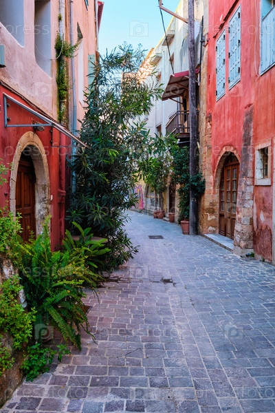Живописные улицы Ханьи Венецианский город с уютными старыми домами.Утром в деревне Ханья греческий Чанака, остров Крит, Греция