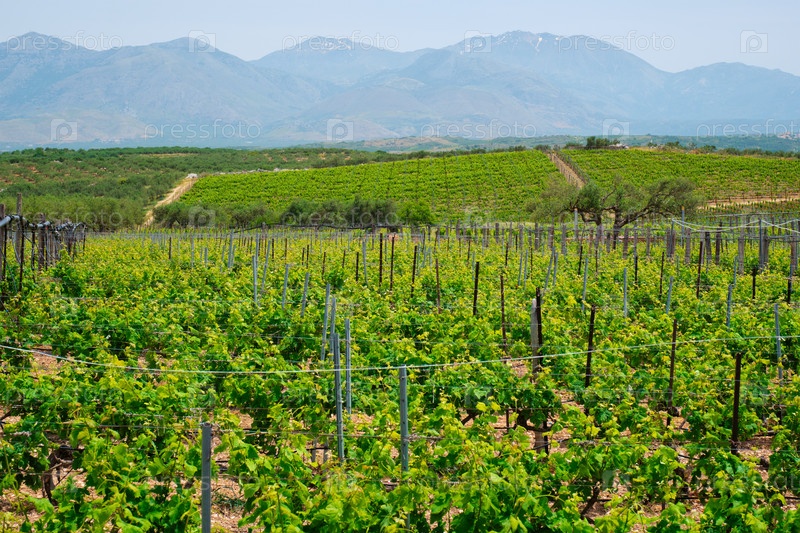 Виноградник с виноградными рядами.Остров Крит, Греция