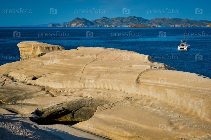 Белые скалы знаменитой туристической достопримечательности острова Милос Саранико пляж и яхтенная лодка на пляже Саринико, остров Милос, Греция