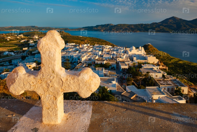 Христианский крест и деревня Плака на острове Милос над красными цветами геранима при закате в Греции