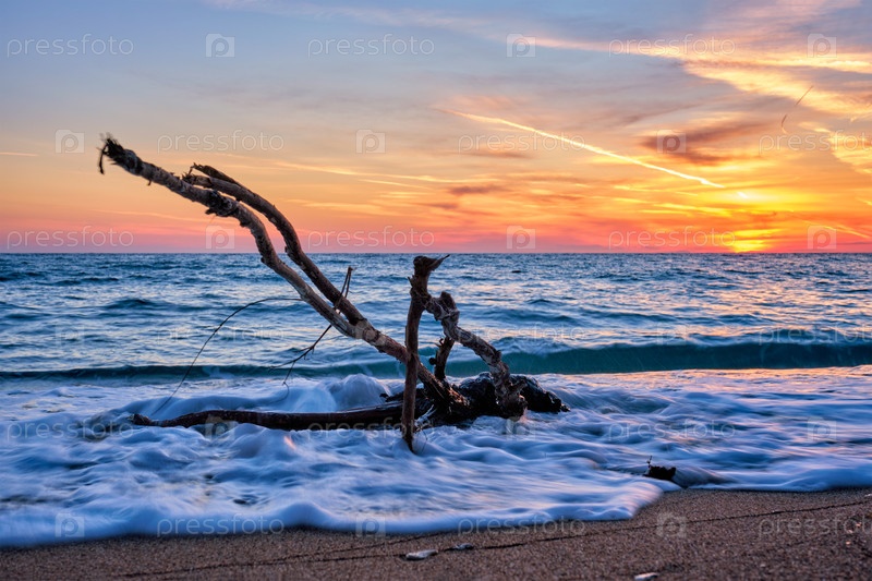 Ствол дерева застрял в воде на тропическом пляже при красивом закате. Природный морской пейзаж. Солнце садится в волнах Эгейского моря. Пляж Агиос-Иоаннис, остров Милос, Греция