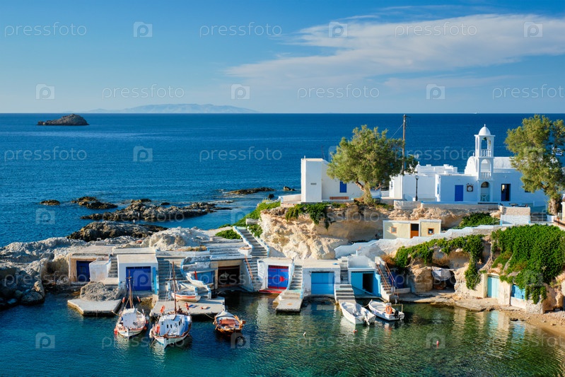 Типичным греческим пейзажным видом на остров является небольшая гавань с рыбацкими лодками в кристально чистой бирюзовой воде, традиционные белые церковные дома