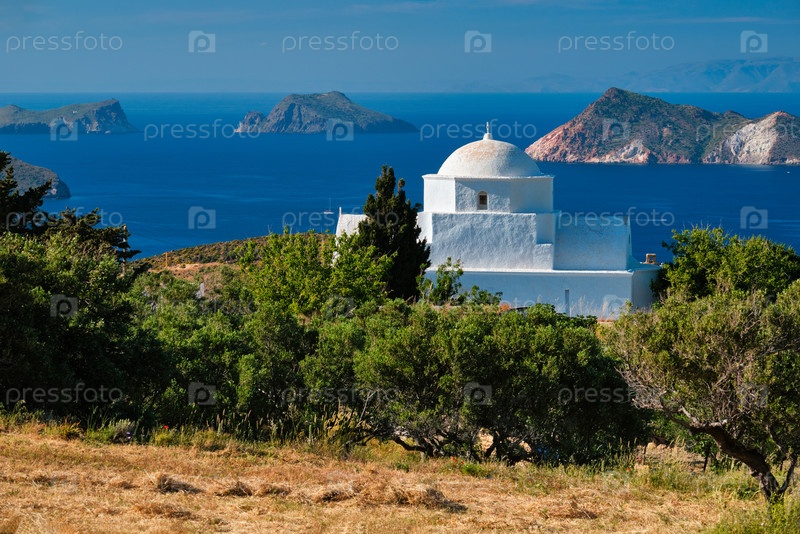 Живописный вид на остров Милос, Эгейское море и традиционную греко-православную церковь