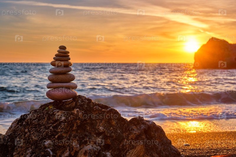 Концепция равновесия и гармонии. куча основных камней на пляжном побережье моря в природе при закате солнца. медитативное искусство укладки камня