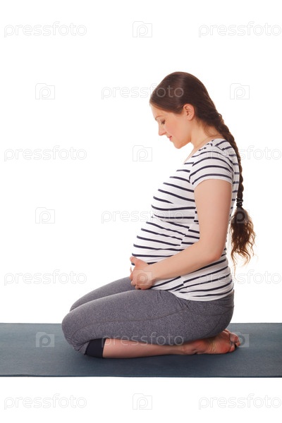 Упражнения йоги для беременности - Вирасана Йога Асана Поза Героя на колене Изолированная от белого