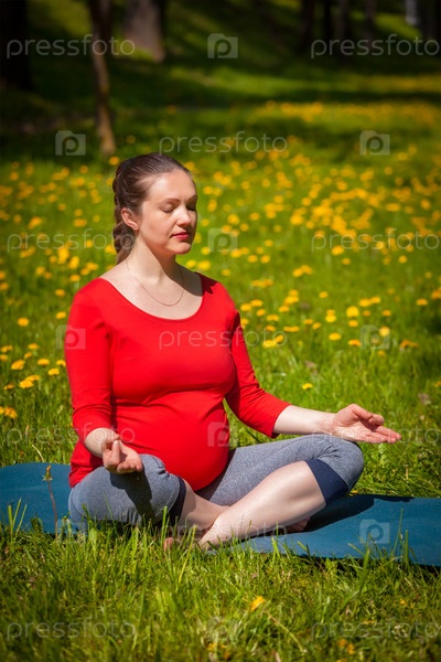 Упражнения по йоге беременности - беременная женщина, медитирующая в сухасанской асани йоги, легко позирует подбородком на траве с одуванчиками летом