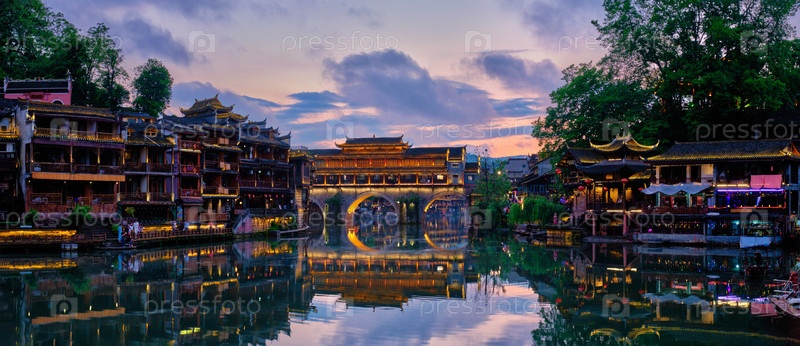 Китайская туристическая достопримечательность - панорама древнего города Феникс на реке Тяо Цзян, освещенная ночью