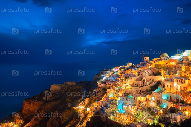 Известное греческое культовое живописное туристическое направление Деревня Оя с традиционными белыми домами и ветряными мельницами на острове Санторини в вечерний синий час, Греция