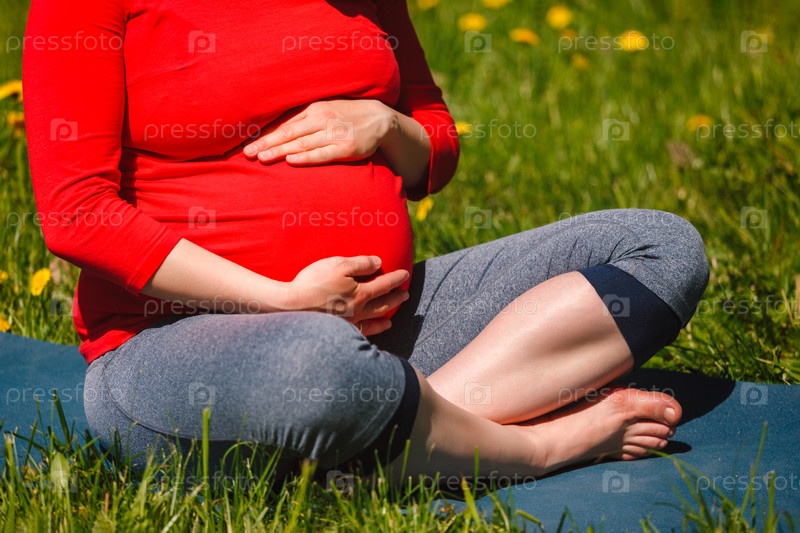 Беременный мужчина занимается пуной Suhasa на открытом воздухе на траве