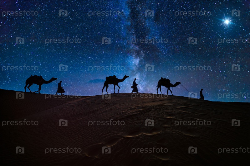 Рождественская концепция рождения Иисуса - Поклонение волхвам, трем мудрецам, трем царям и трём библейским волшебникам с силуэтами верблюдов, путешествующих по песчаным дюнам пустыни, следует за звездой Вифлеема ночью