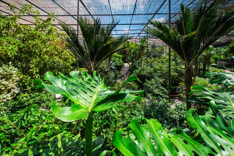 Внутренний вид холодного дома Estufa Fria - это теплица с садами, прудами, растениями и деревьями с листьями Monstera deliciosa на переднем плане в Лиссабоне, Португалия