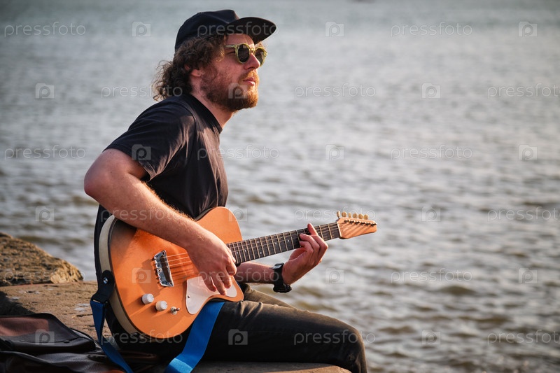 Уличный хипстер-музыкант в черном играет на электрической гитаре снаружи, сидя на пирсовой promenade при закате солнца