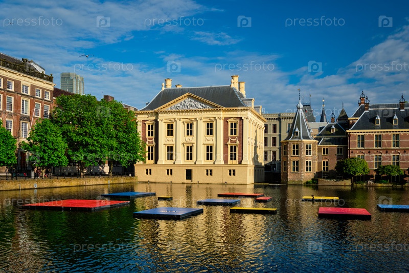 Тип здания Parliament Binnenhof и Museum Mauritsuis и Hoffveiver Lake.Гага, Нидерланды