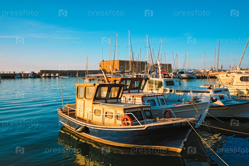 Форт Кулес Кастелло Замок Маре в Гераклионе и греческие рыбацкие лодки, пришвартованные в порту Венеции, остров Крит, Греция на закате
