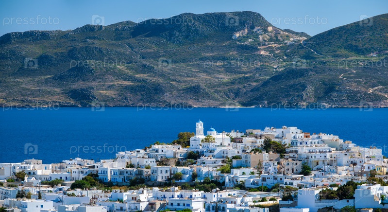 Панорамный вид на деревню Плака с традиционной греческой церковью.Остров Милос, Греция