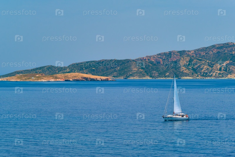 Яхта в голубых водах Эгейского моря недалеко от острова Милос, Греция