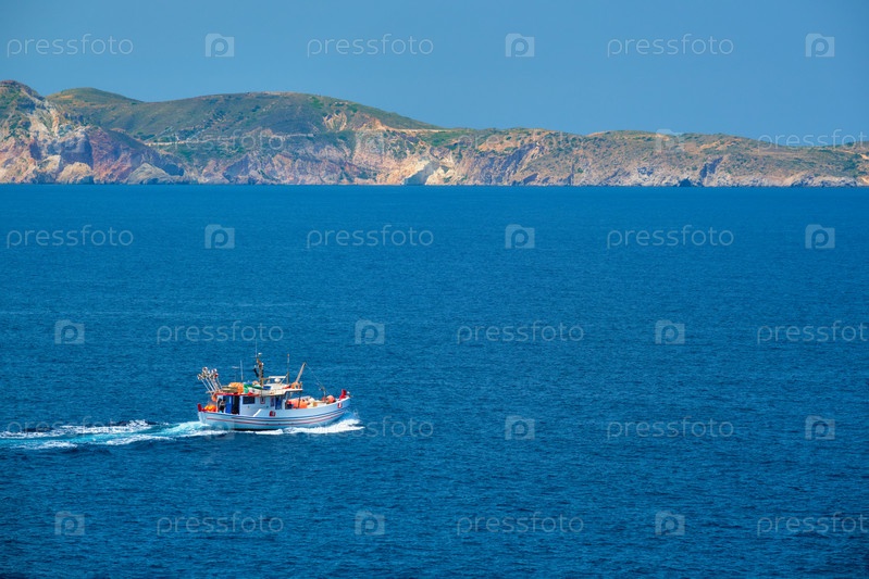 Греческая рыбацкая лодка в голубых водах Эгейского моря недалеко от острова Милос, Греция