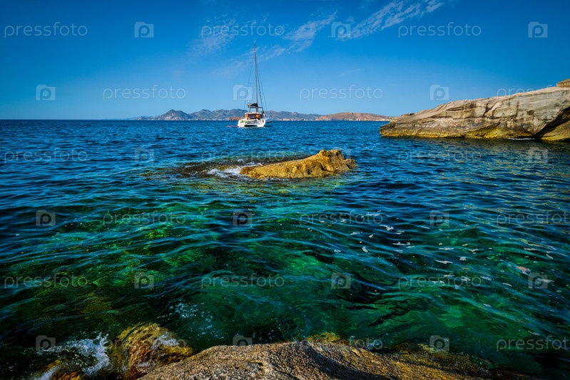 Яхта в Эгейском море возле белых скал пляжа Саранико, остров Милос, Греция
