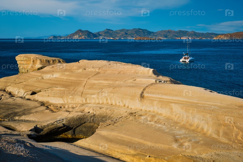 Белые скалы знаменитой туристической достопримечательности острова Милос Саранико пляж и яхтенная лодка на пляже Саринико, остров Милос, Греция