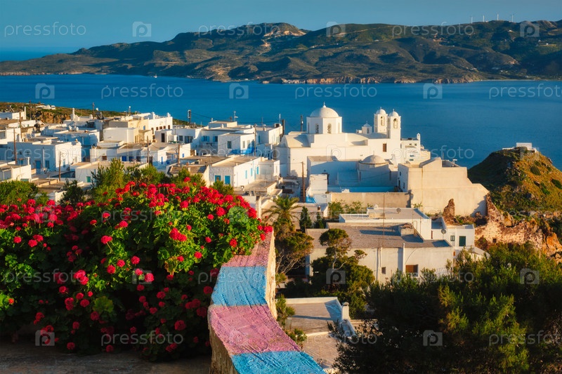 Живописный вид на греческий город Плака на острове Милос над красными цветами геранима