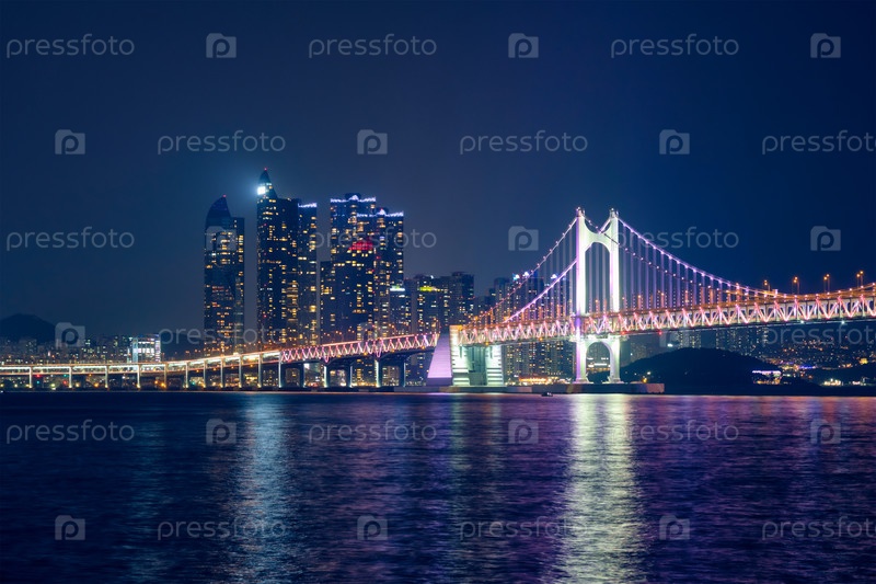 Мост Гванган и небоскребы освещаются ночью.Бусан, Южная Корея