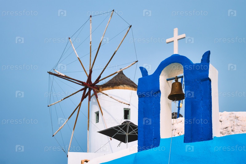 Старая греческая ветряная мельница на острове Санторини в городе Оа с лестницей на улице