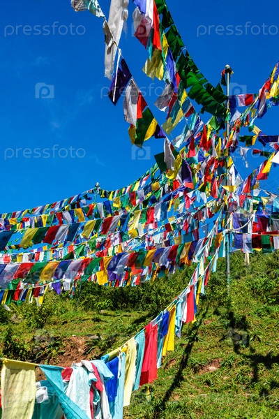 Лео буддийские молитвенные флаги в Маклеод Ганжа, Химачал-Прадеш, Индия