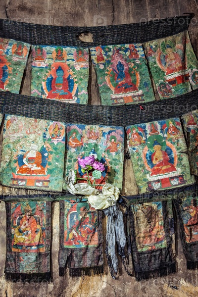Танки - это буддийские религиозные картины на шелке.Thiksey gompa (тибетский буддийский монастырь), Ладакх, Индия