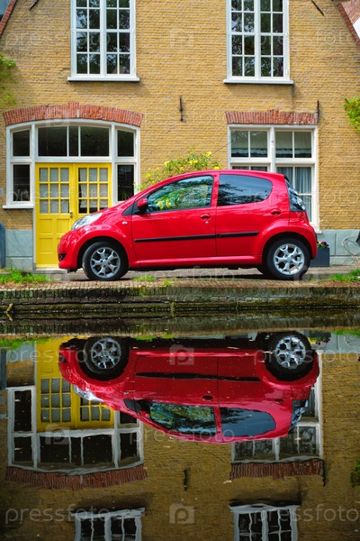 Красный автомобиль на набережной канала на улице Делфт с отражением