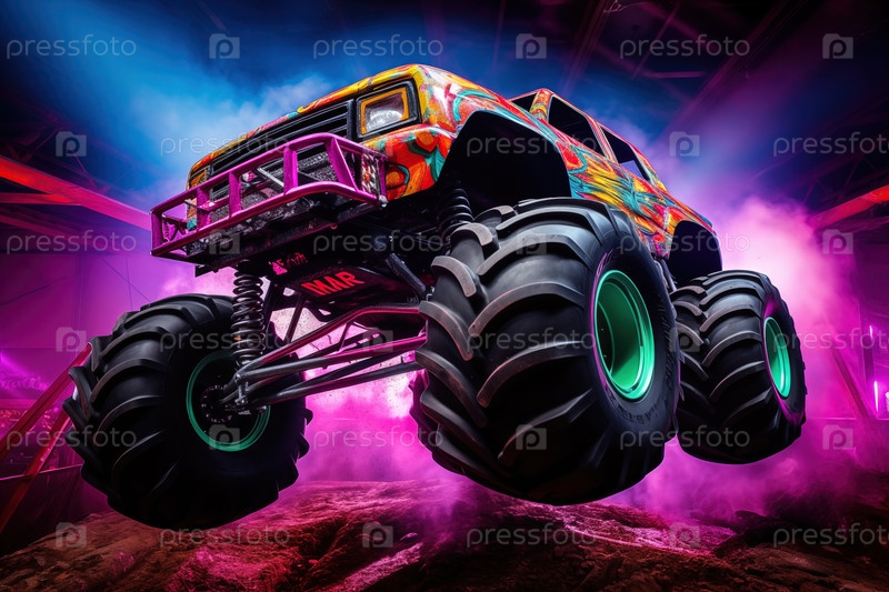 Чудовищный грузовик с неоновым освещением, прыгающий с дороги в облаке пыли