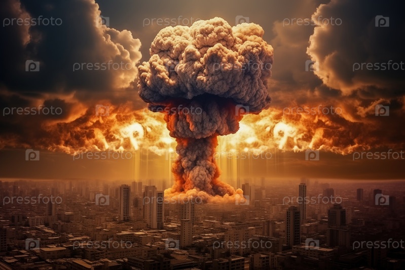 Ядерный взрыв и грибное облако на горизонте. Взрыв разрушает здания, вызывает хаос и разрушения. Апокалиптическое настроение. Разрушение войны или последствия катастрофы