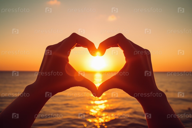Две руки в форме сердца, вытянутые на фоне захватывающего заката океана.Любовь и тепло на День святого Валентина или любое романтическое событие