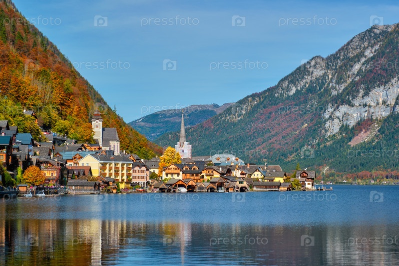 Австрийское туристическое направление деревня Холлштатт на озере Халлстаттер в австрийских Альпах осенью. регион Зальцкаммергут, Австрия