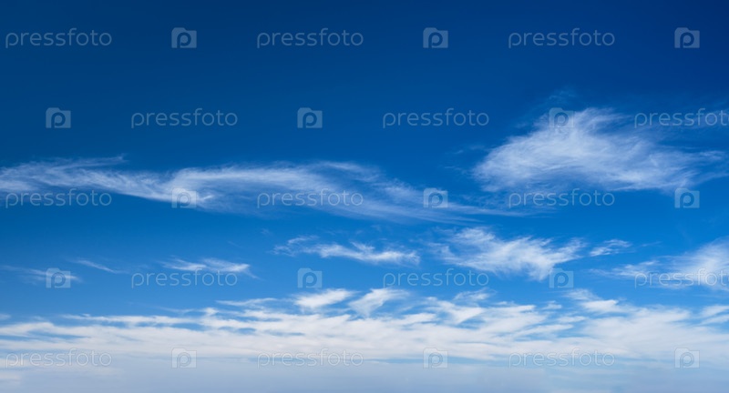 Голубое ясное небо с белыми цирковыми вращающимися облаками