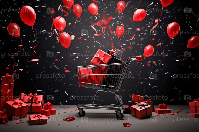 Концепция Black Friday Sale - черные коробки с красными лентами в корзине покупок на чёрном фоне