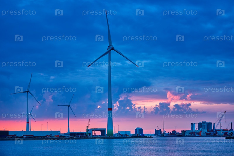 Ветряные турбины в порту Антверпена вечером
