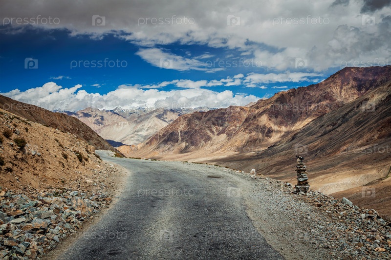 Дорога в Гималаях недалеко от перевала Кардунг Ла с каменным пещером.Ладакх, Индия