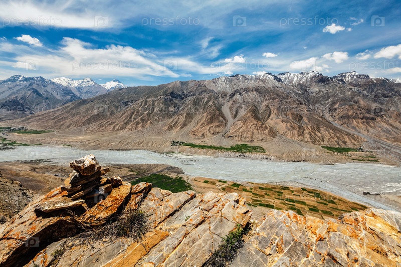 Вид на долину Спити и реку Спити в Гималаях с каменным погребом. Долина Спити, Химачал-Прадеш, Индия