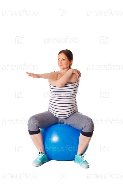 Концепция упражнений во время беременности - беременная женщина выполняет растяжные упражнения с помощью тренировочного мяча, изолированного на белом фоне