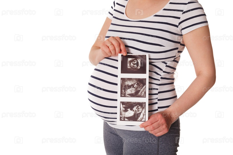 Беременная женщина стоит и держит ультразвуковое изображение ребенка, выделенное на белом фоне