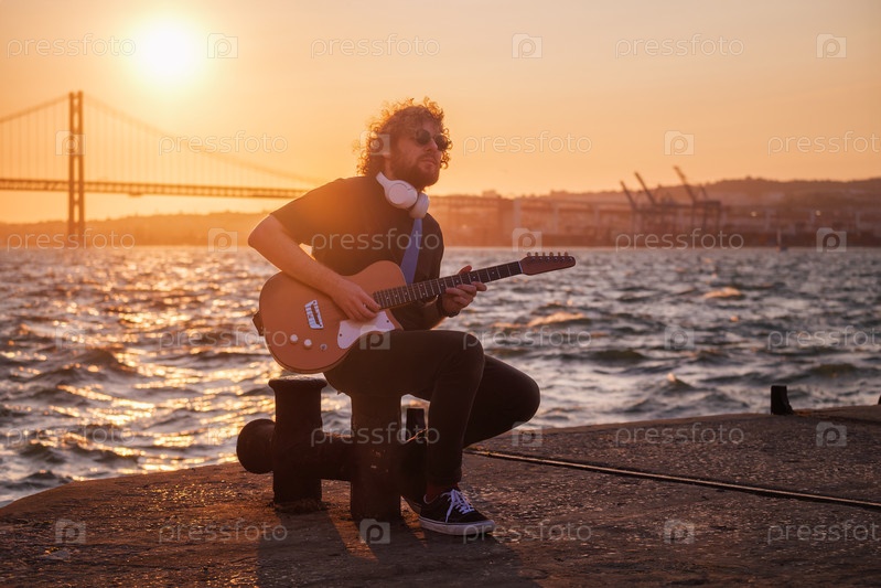 Уличный музыкант играет на электрической гитаре на улице